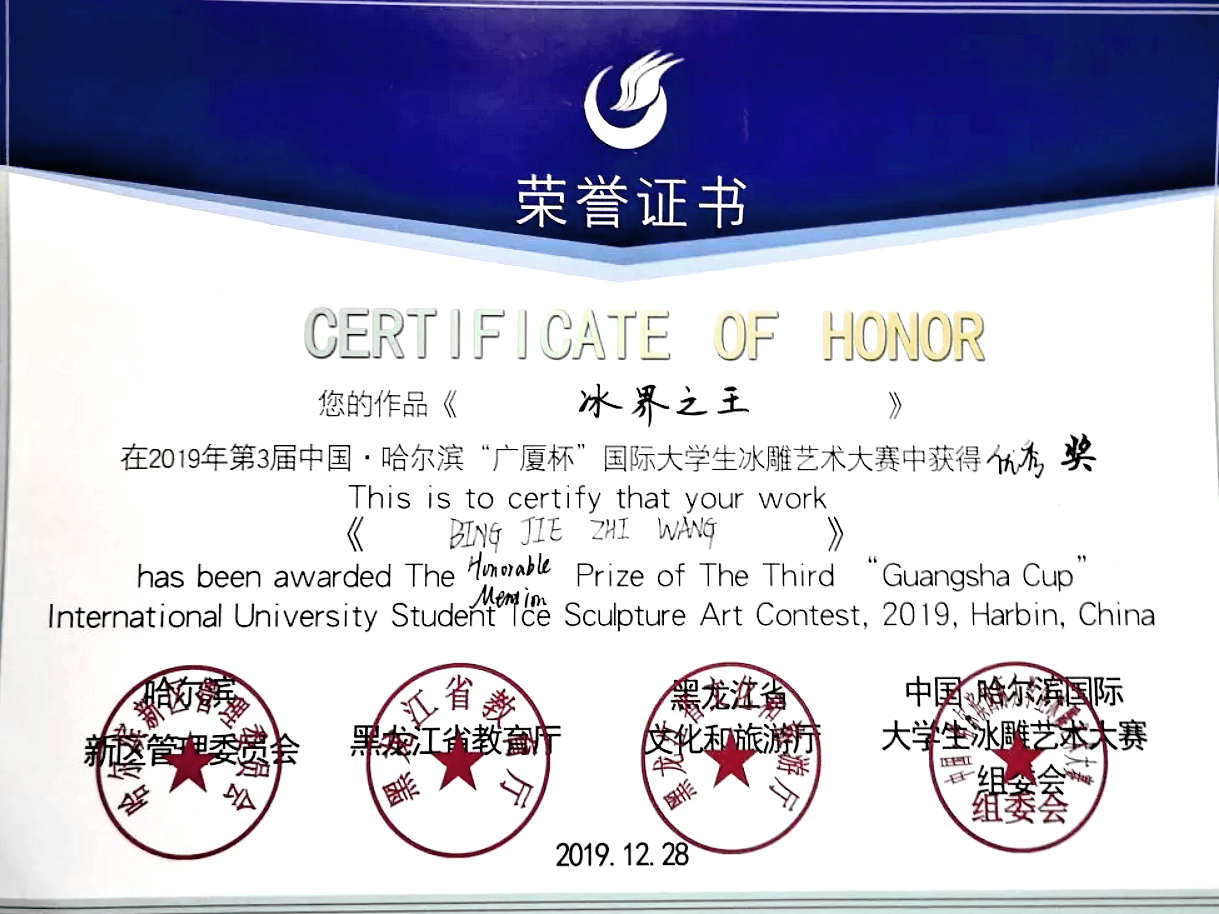 日前,建筑学院三组参赛选手在指导老师李笑鲜、李文静的带领下,参加2019年第3届中国·哈尔滨“广厦杯”国家大学生冰雕艺术大赛并均取得“优秀奖”荣誉证书。