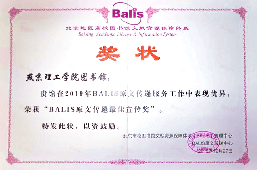 12月27日,2019年BALIS原文传递服务总结大会在人民大学召开,会议就2019年BALIS原文传递工作进行总结表彰。燕京理工学院图书馆荣获“BALIS原文传递最佳宣传奖”,王莹老师获得“先进个人”荣誉称号。