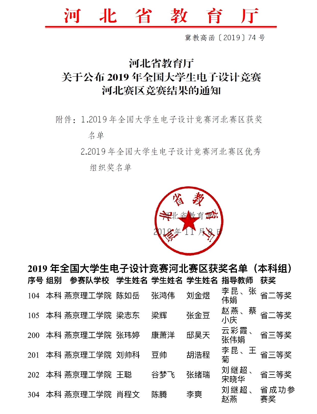近日,河北省教育厅公布“2019年全国大学生电子设计竞赛河北赛区竞赛”最终获奖名单。我校学子喜获河北赛区省二等奖2人、三等奖3人、成功参赛奖1人,具体名单如下: