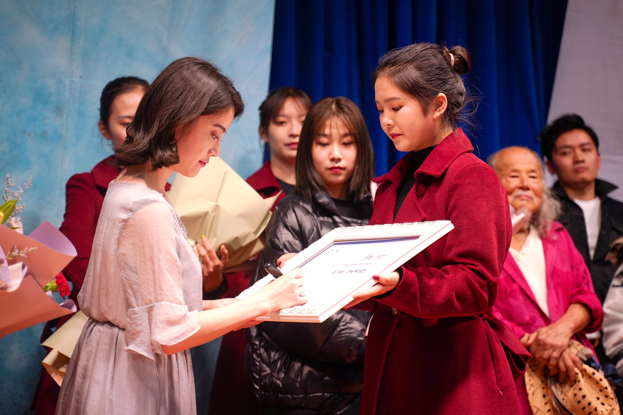 我院学子代表向演员们鲜花表达对作品的喜爱之情,并邀请三位老师在本硕直通项目签名板上留下签名和祝福。