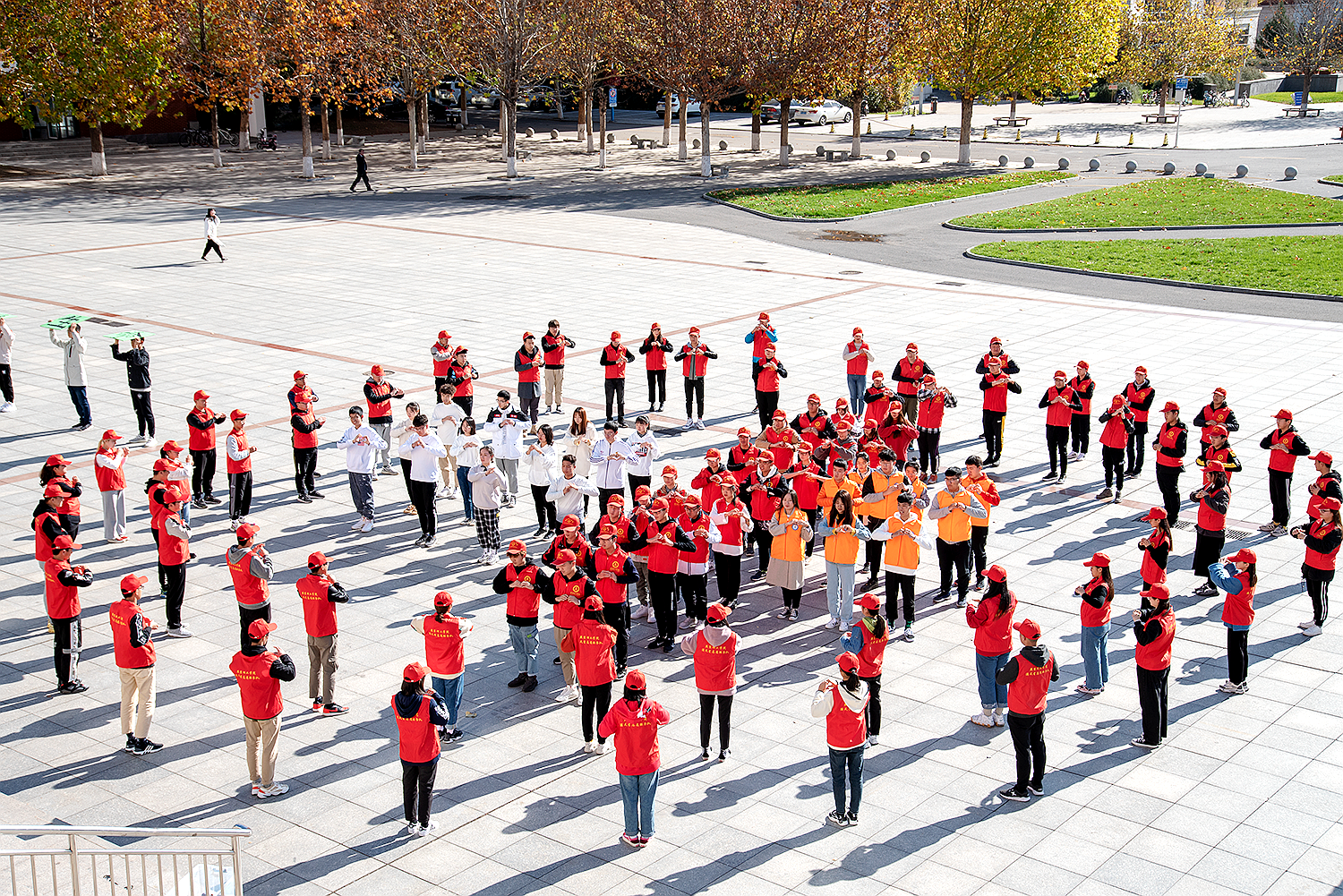 同学们身穿红、白、橙色马甲分成四个方队站在M楼前,伴随着音乐的响起奔向同一个地方,井然有序的排列成禁烟标志。在音乐的律动下,同学们展示手势舞,说了大家的心声。烟草危害是世界上最严重的公共卫生问题之一,吸烟和二手烟暴露严重危害人类健康,禁烟是保护自己与他人生命健康的行为。