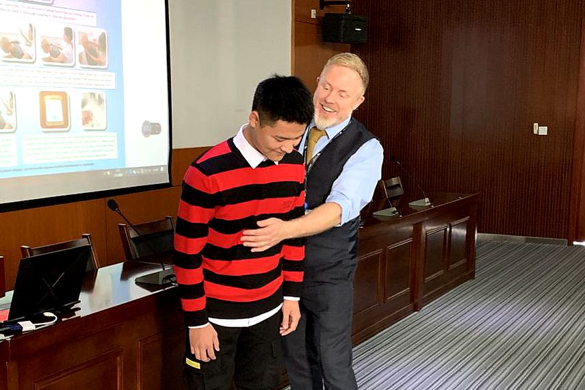 讲座中,Jade教授通过车祸事故的急救情景同现场师生提问互动,并亲自示范了窒息和异物卡喉的急救措施,展示了呼吸道异物梗阻的处理方法是先实行5次拍背法,后实行5次压胸法,重复直至阻塞物咳出口腔。现场指导学生们分组练习。讲座现场同学们聚精会神,不仅掌握了更多的急救知识,对护理行业的工作也有了更加深刻的认识。