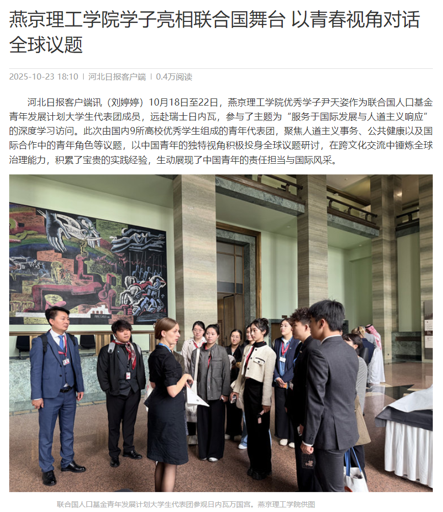 河北日报客户端讯(刘婷婷)10月18日至22日,燕京理工学院优秀学子尹天姿作为联合国人口基金青年发展计划大学生代表团成员,远赴瑞士日内瓦,参与了主题为“服务于国际发展与人道主义响应”的深度学习访问。此次由国内9所高校优秀学生组成的青年代表团,聚焦人道主义事务、公共健康以及国际合作中的青年角色等议题,以中国青年的独特视角积极投身全球议题研讨,在跨文化交流中锤炼全球治理能力,积累了宝贵的实践经验,生动展现了中国青年的责任担当与国际风采。