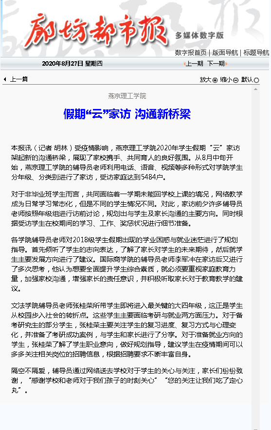 【廊坊都市报】燕京理工学院 假期“云”家访 沟通新桥梁
