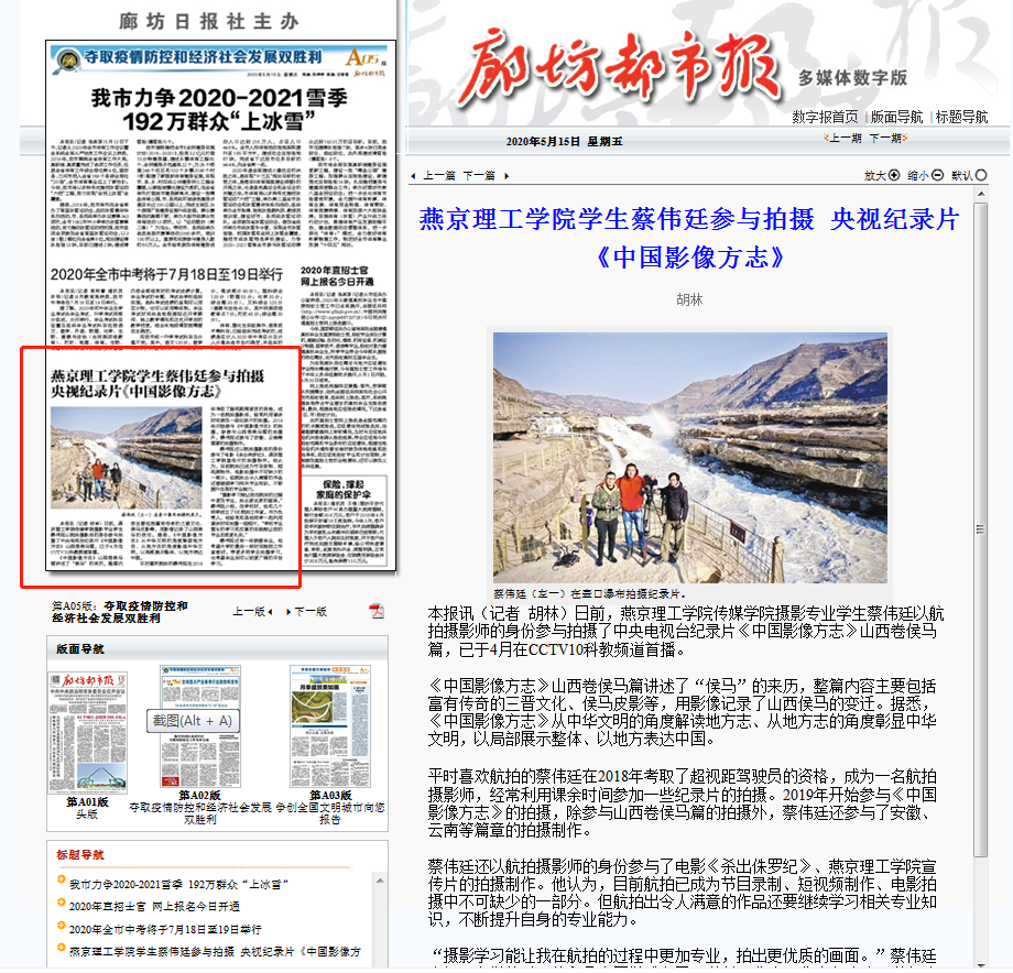 廊坊都市报:燕京理工学院学生蔡伟廷参与拍摄 央视纪录片《中国影像方志》