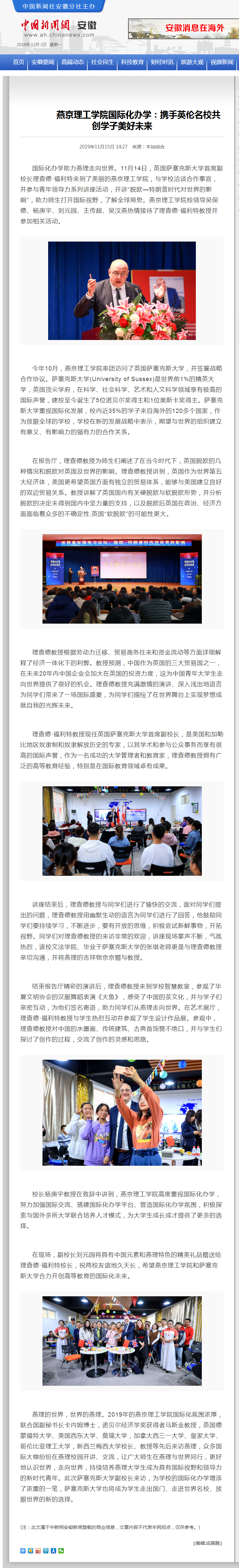 燕理的世界,世界的燕理。2019年的燕京理工学院国际化氛围浓厚,联合国副秘书长卡内姆博士,诺贝尔经济学奖获得者马斯金教授,英国德蒙福特大学、美国西东大学、莫瑞大学,加拿大西三一大学、皇家大学、哥伦比亚理工大学,新西兰梅西大学校长、教授等先后来访燕理,众多国际大咖纷纷在燕理校园开讲、交流,让广大师生在燕理与世界同行,更好地认识世界,走向世界,持续培养燕理大学生成为具有国际视野和领导力的新时代青年。此次萨塞克斯大学副校长来访,为学校的国际化办学增添了浓重的一笔,萨塞克斯大学也将成为学生走出国门、走进世界名校、放眼世界的新的选择。