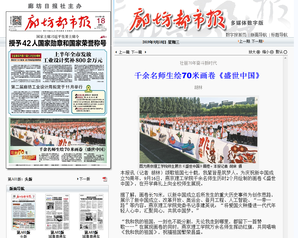 廊坊都市报:壮丽70年奋斗新时代 千余名师生绘70米画卷《盛世中国》