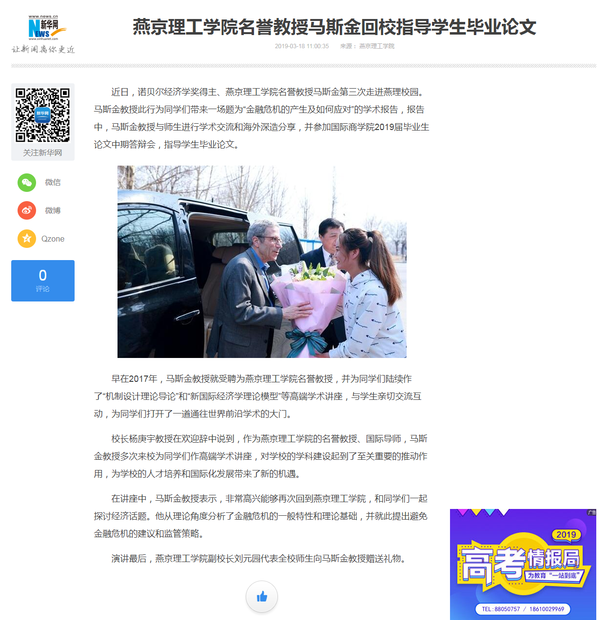 近日,诺贝尔经济学奖得主、燕京理工学院名誉教授马斯金第三次走进燕理校园。马斯金教授此行为同学们带来一场题为“金融危机的产生及如何应对”的学术报告,报告中,马斯金教授与师生进行学术交流和海外深造分享,并参加国际商学院2019届毕业生论文中期答辩会,指导学生毕业论文。