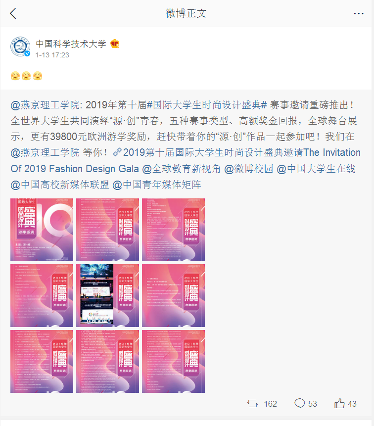 微博@中国科学技术大学燕京理工学院向全球发邀请:第十届国际大学生时尚设计盛典赛事发布