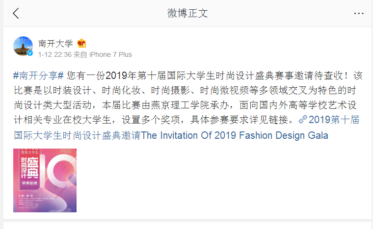 微博@南京邮电大学燕京理工学院向全球发邀请:第十届国际大学生时尚设计盛典赛事发布