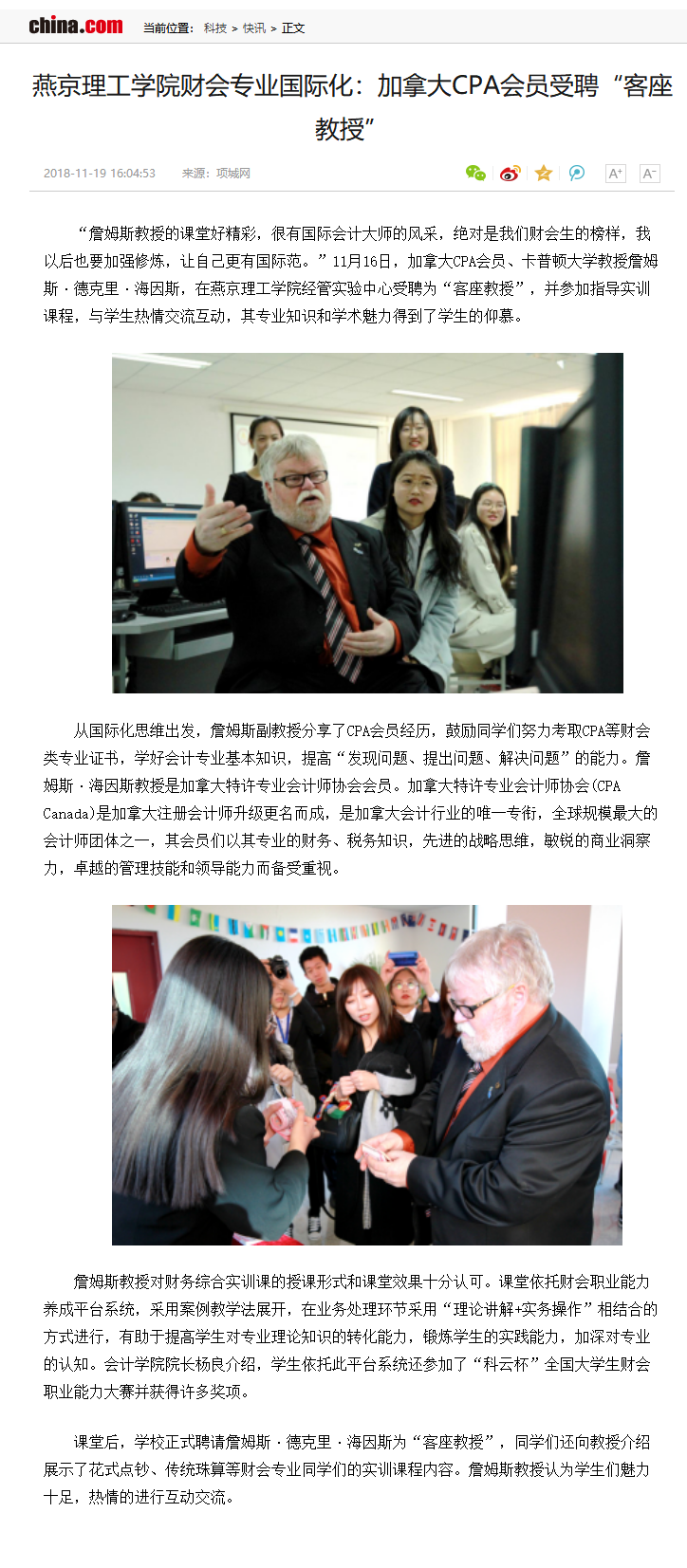 中华网:燕京理工学院财会专业国际化:加拿大CPA会员受聘“客座教授”