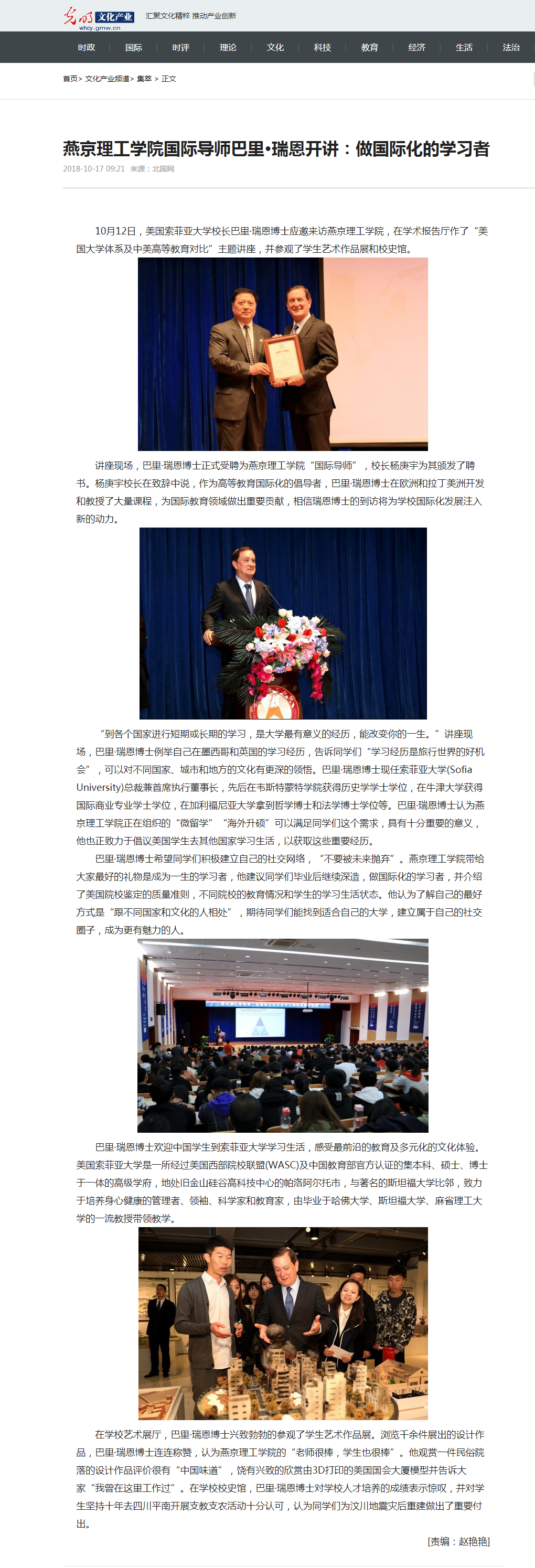 光明网等媒体报道:燕京理工学院国际导师巴里·瑞恩开讲:做国际化的学习者