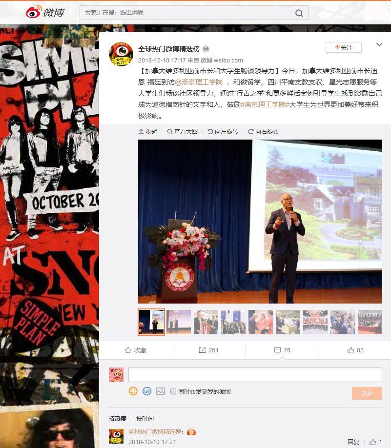 微博大V @全球热门微博精选榜:加拿大维多利亚前市长和大学生畅谈领导力