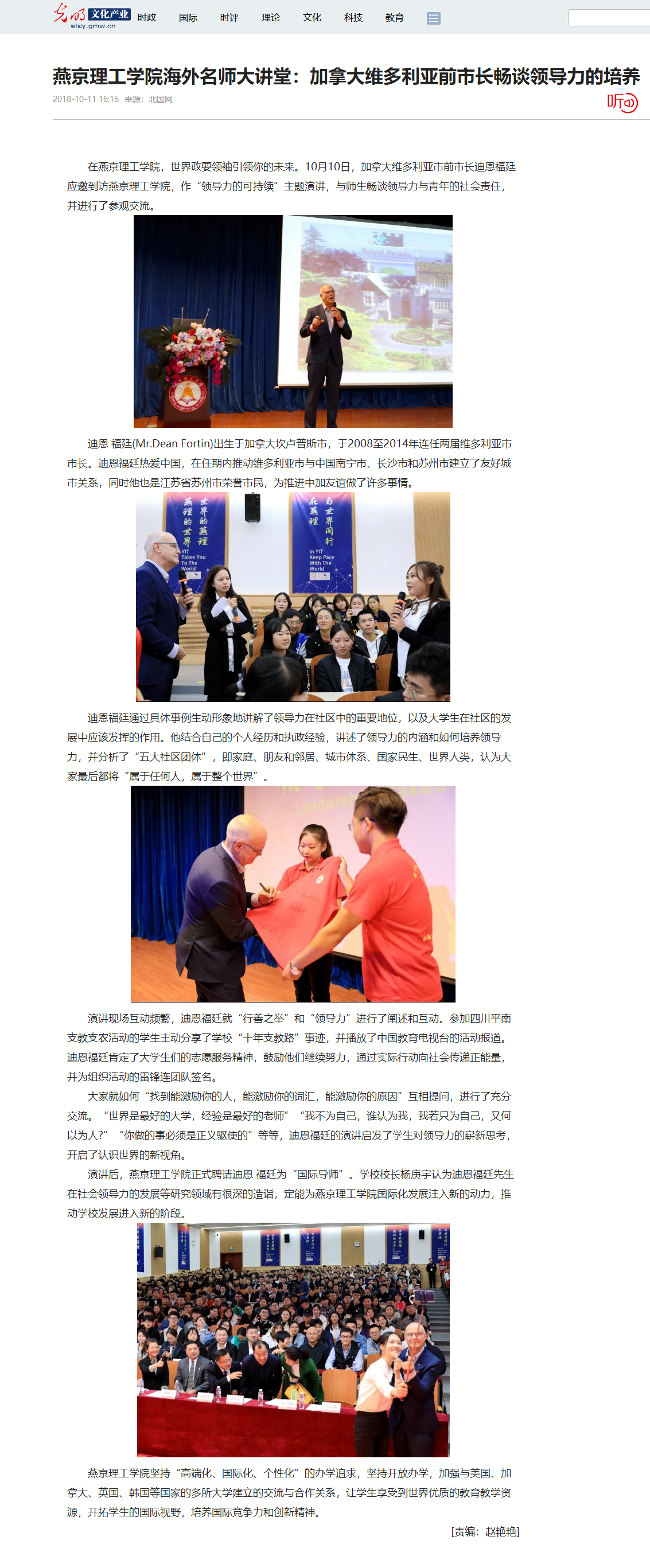 在燕京理工学院,世界政要领袖引领你的未来。10月10日,加拿大维多利亚市前市长迪恩•福廷应邀到访燕京理工学院,作“领导力的可持续”主题演讲,与师生畅谈领导力与青年的社会责任,并进行了参观交流。