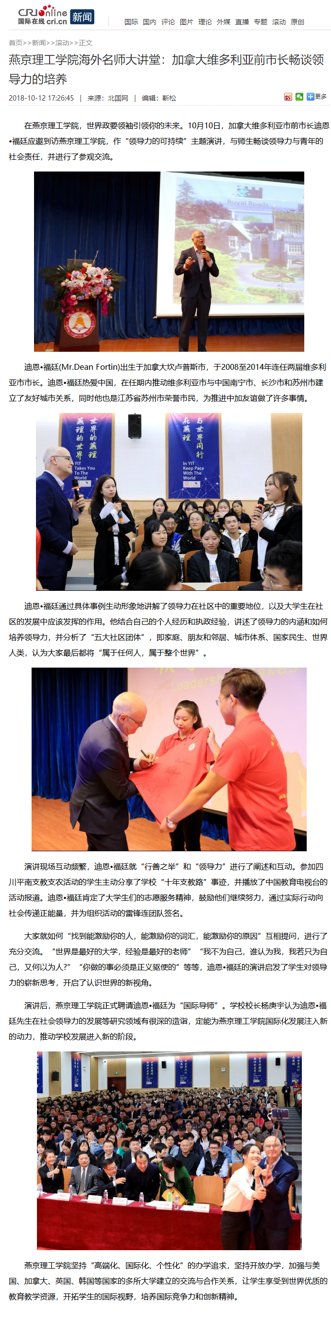 国际在线:燕京理工学院海外名师大讲堂:加拿大维多利亚前市长畅谈领导力的培养