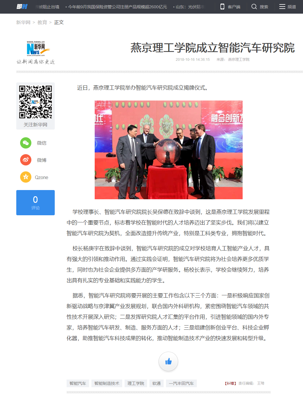 近日,燕京理工学院举办智能汽车研究院成立揭牌仪式。