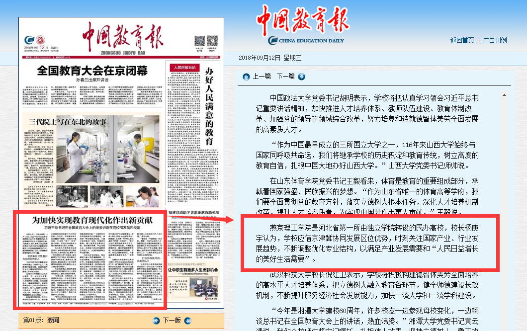 9月12日,中国教育报头版报道全国教育大会盛况,燕京理工学院热议习近平总书记重要讲话精神获摘登,展现了燕京理工学院的新时代新规划新作为,为加快实现教育现代化作出新贡献。