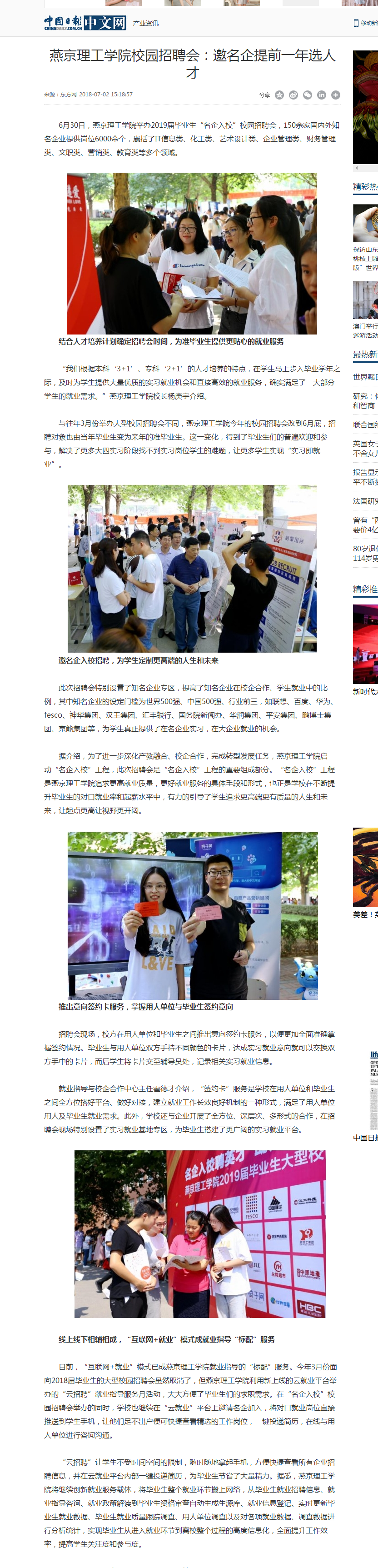 “我们根据本科‘3+1’、专科‘2+1’的人才培养的特点,在学生马上步入毕业学年之际,及时为学生提供大量优质的实习就业机会和直接高效的就业服务,确实满足了一大部分学生的就业需求。”燕京理工学院校长杨庚宇介绍。