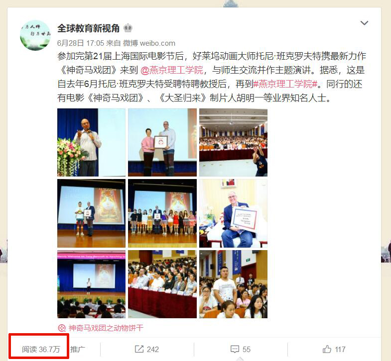 新浪微博大V@全球教育新视角:好莱坞动画大师托尼·班克罗夫特携最新力作《神奇马戏团》来到 @燕京理工学院