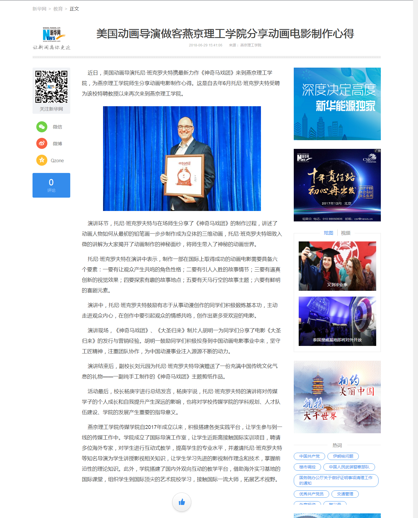 新华网:美国动画导演做客燕京理工学院分享动画电影制作心得