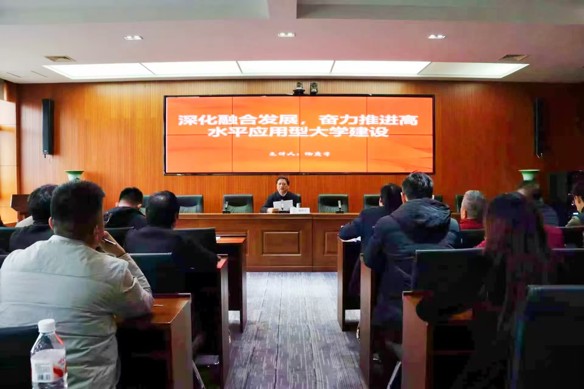 动员讲话结束后,校长杨庚宇教授以“深入融合发展,奋力推进高水平应用型大学建设”为题,为全体学员带来本次培训的第一讲。杨校长围绕学校发展关键方向从三方面展开路径阐述:明确要以“好老师”为标准打造素质过硬、结构合理的高水平教师队伍,强调培育“大师”需具备大胸怀与大格局,同时要求管理干部同步提升包容意识;提出通过开阔思路、加强校际合作、善用网络资源来提升学科专业水平,进一步拓宽办学层次;围绕高质量人才培育需求,确定深化产教融合、推进教育教学数字化转型、实施质量提升工程三大举措,助力培养高素质应用型人才。他着重强调,唯有坚持“融合发展”核心战略,通过创新体制机制、建强教师队伍、激活科研创新动力、拓展校地合作空间,才能破解学校发展难题、增强办学活力、提升核心竞争力,为高水平应用型大学建设提供支撑。