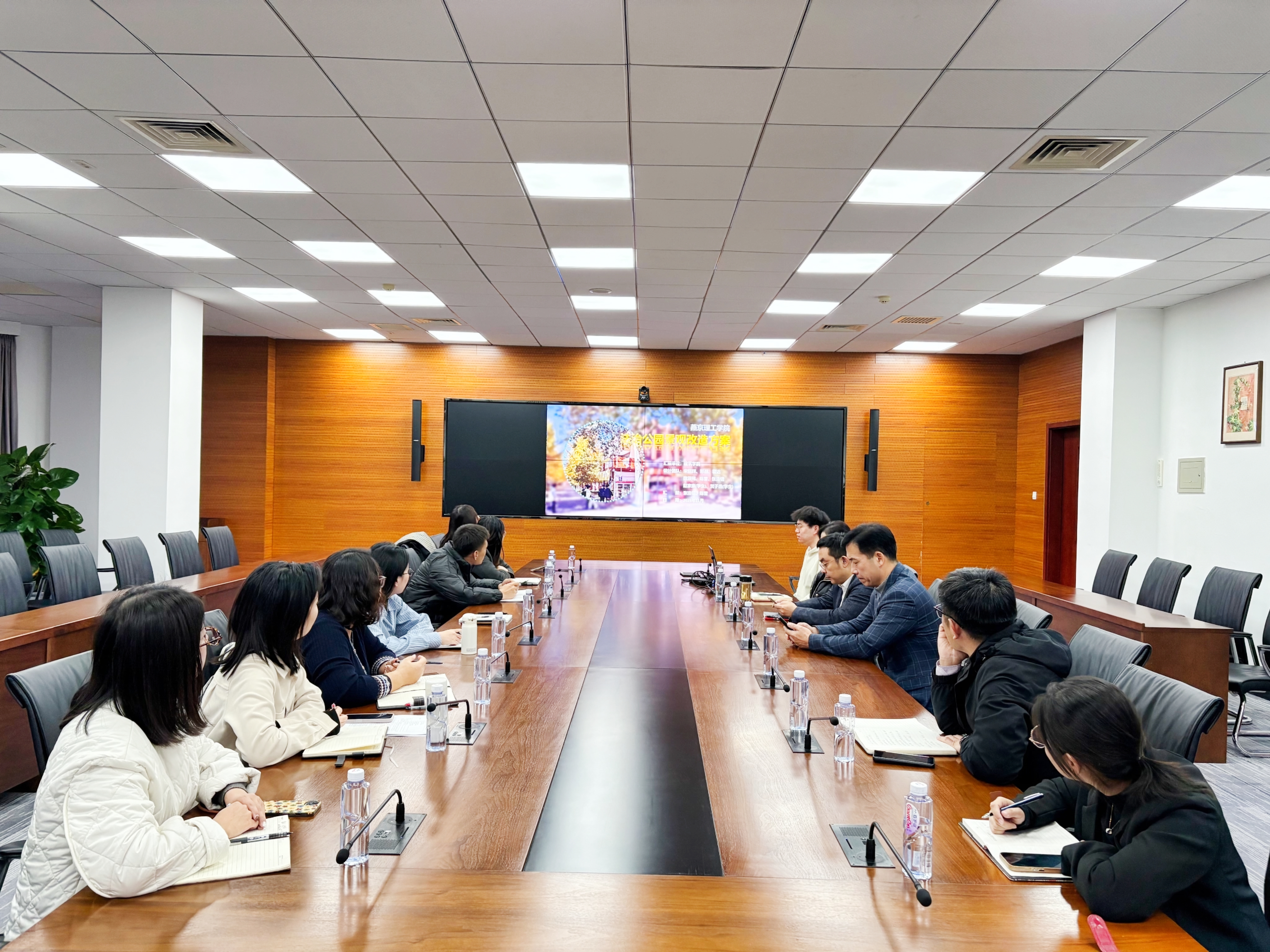 与会人员就细节优化、落地可行性、资源整合等积极建言献策,凝聚建设共识。法学院从内容内核出发,建议增设“宪法墙”景观,强化法治宣传教育引导功能。艺术学院在色彩搭配上提供专业建议。基建处就公园内道路施工和选材给出合理建议。会议决定,由法学院提供法治文化发展历程、法治宣传要素内容,再由项目设计单位建筑学院进一步优化完善方案。