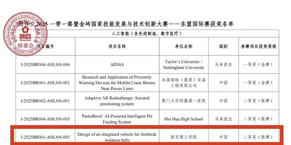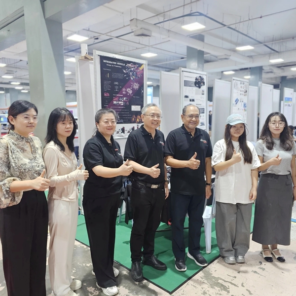 与此同时,在吉隆坡工程科技与科学展现场,燕京理工学院参赛学生代表对参赛作品逐一进行全英文讲解,详细介绍作品的设计创新、功能特性和实践意义,与评委老师深入交流探讨,全面展示作品的创新价值与应用潜力,认真接受评委的专业打分与点评指导。经过前期的校内指导、国内评审等环节,最终有 6 件作品被选送参展。其中,防火隔离带一体车设计在“一带一路”金砖国家技能发展与技术创新大赛中荣获银奖。在吉隆坡工程科技与科学展中,燕京理工学院 6 件参展作品全部获奖。地面工程车系列设计获得金奖;防火隔离带一体车设计获得银奖;医疗废物回收运输车与日用品系列设计获得铜奖;海洋守护者产品设计、适老化超市子母集产品设计获得优秀奖。
