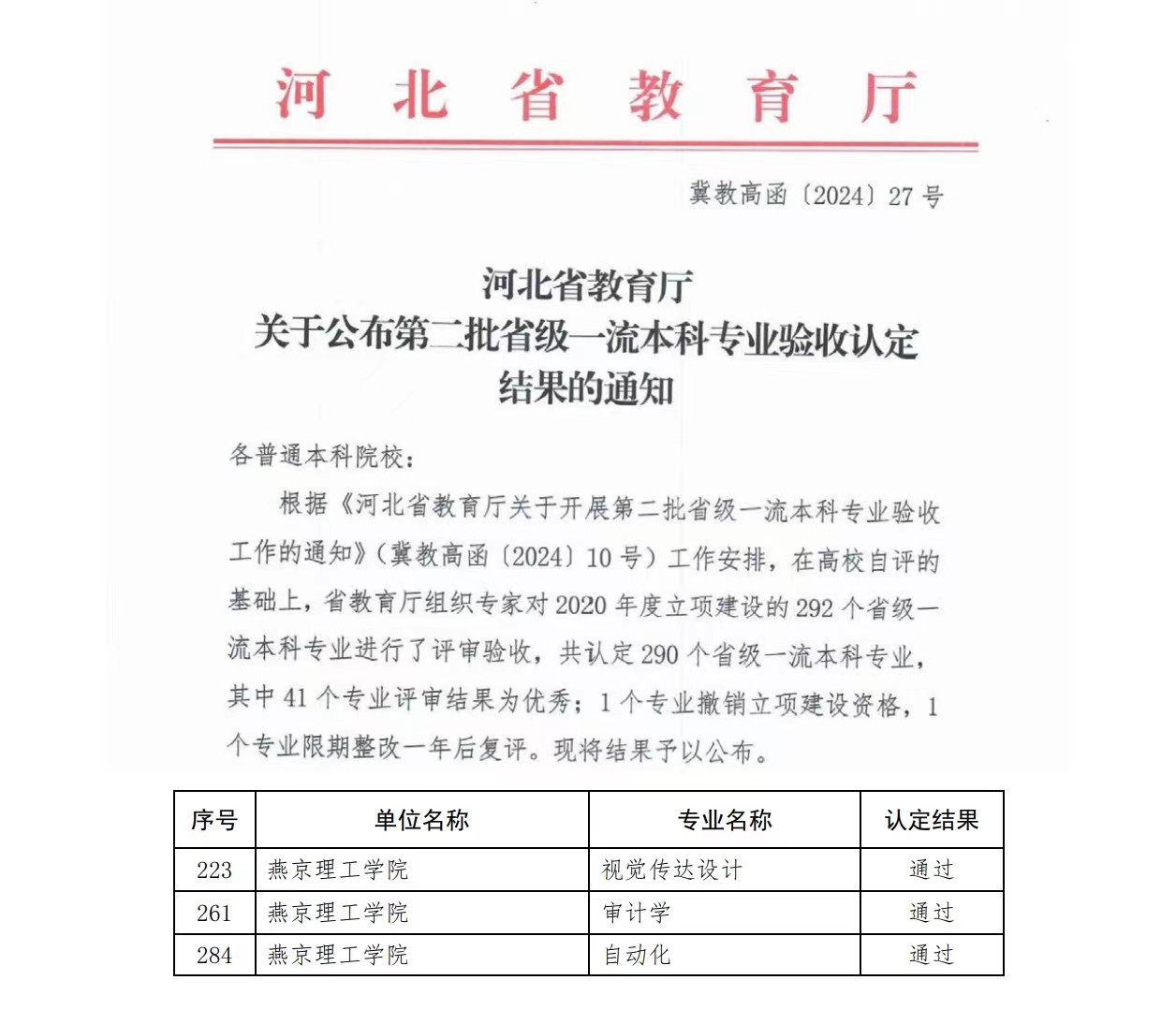 本网讯(教务处 李慧)近日,根据《河北省教育厅关于公布第二批省级一流本科专业验收认定结果的通知》(冀教高函【2024】27号),我校视觉传达设计、审计学和自动化3个专业顺利通过验收,被正式认定为河北省一流本科专业,这是我校在提升教育教学质量,推动学科建设和人才培养方面取得的重要成果,将为我校教育质量的进一步提升注入新的活力。至此,我校已有9个专业被认定为省级一流本科专业。