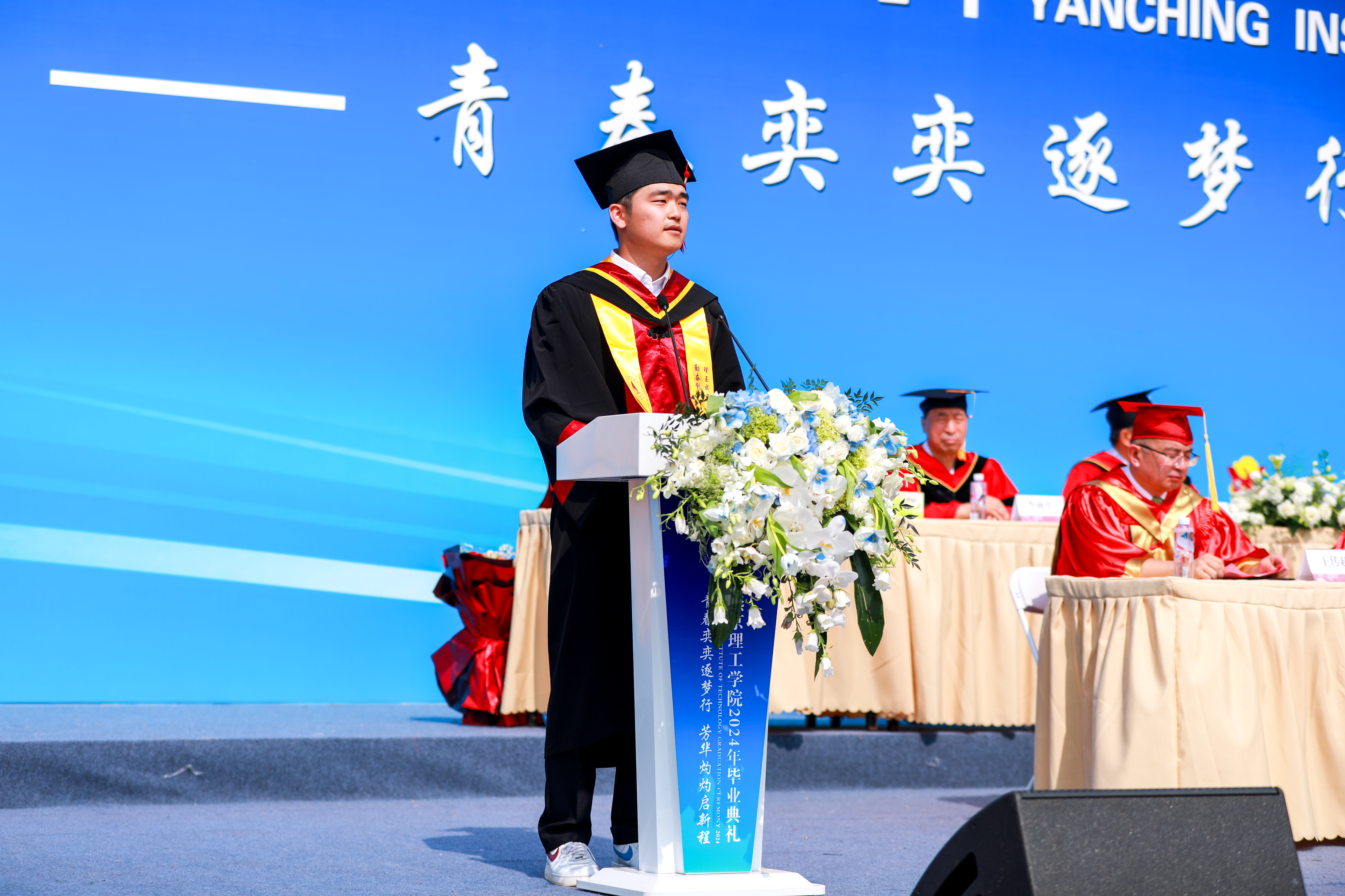 师恩厚重,母校情深。“燕理校园每一方土地,都弥漫着我们的梦想。在老师们的辛勤指导下,我在燕理校园经历了成长的蜕变。”2024届优秀毕业生代表、信息科学与技术学院的聂一凡同学代表毕业生向母校燕理、向求学期间所有师长和亲友表达了感谢,并分享了个人学习成长的经历。