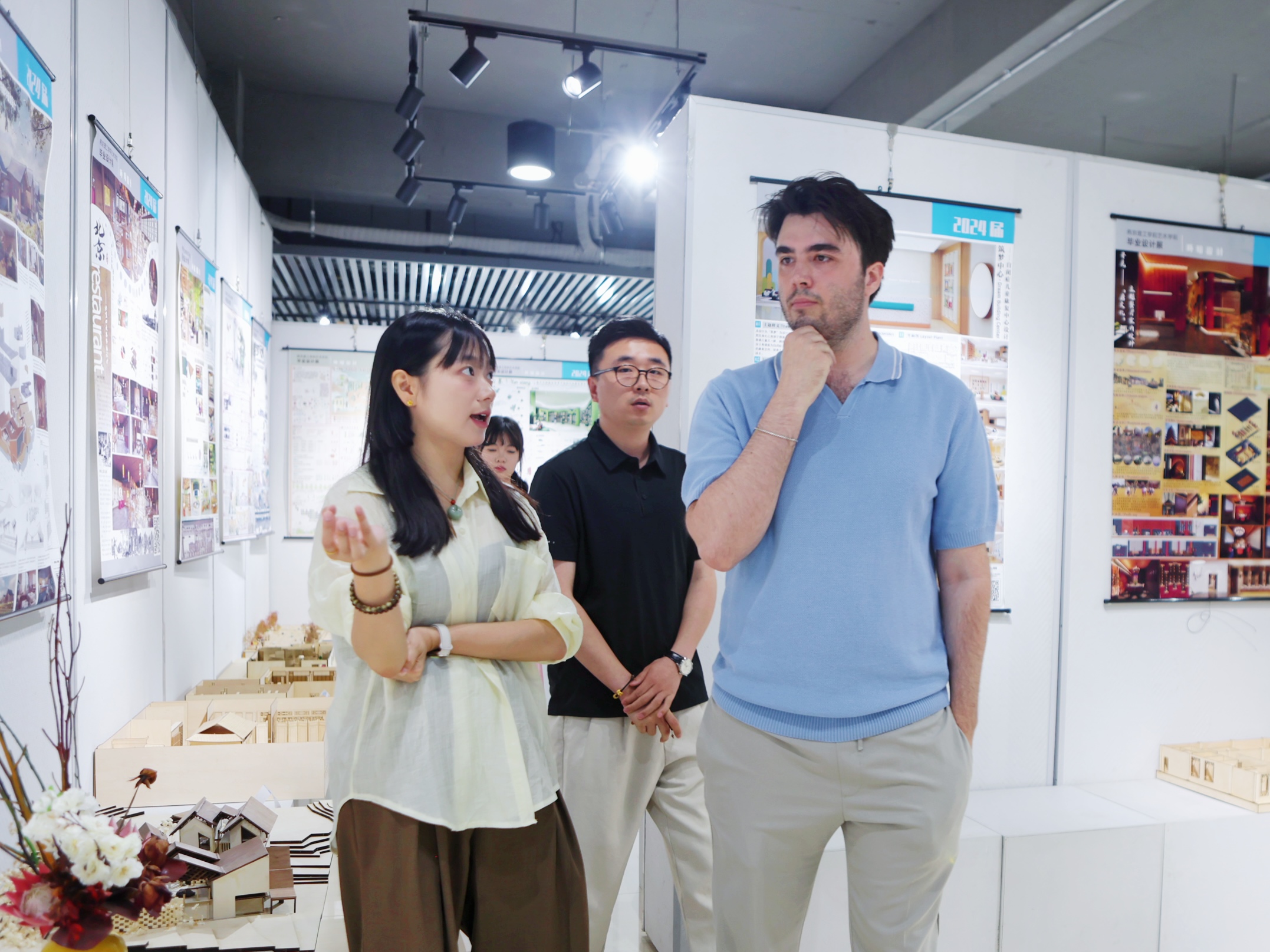 在学生讲解员的带领与介绍下,Fabian Morley参观了艺术展厅陈列的2024届毕业生作品,并与在场师生就艺术作品创作进行了交流,他对我校优秀毕业设计作品表达了欣赏与赞叹。