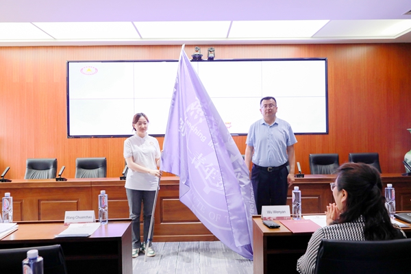 仪式现场,党委副书记、副校长王传超将团旗转交至学员代表手中,团旗将陪伴剑桥—青年领袖训练营UK004团全体师生开启学习之旅。