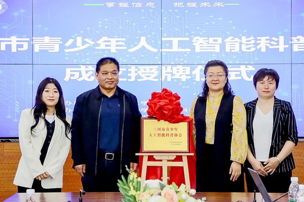 三河市科学技术协会主席郑建国和燕京理工学院副校长吴汶燕为三河市青少年人工智能科普协会成立仪式揭牌,科普协会邢佳会长和信息科学与技术学院院长李丽芬接受授牌,并合影留念。