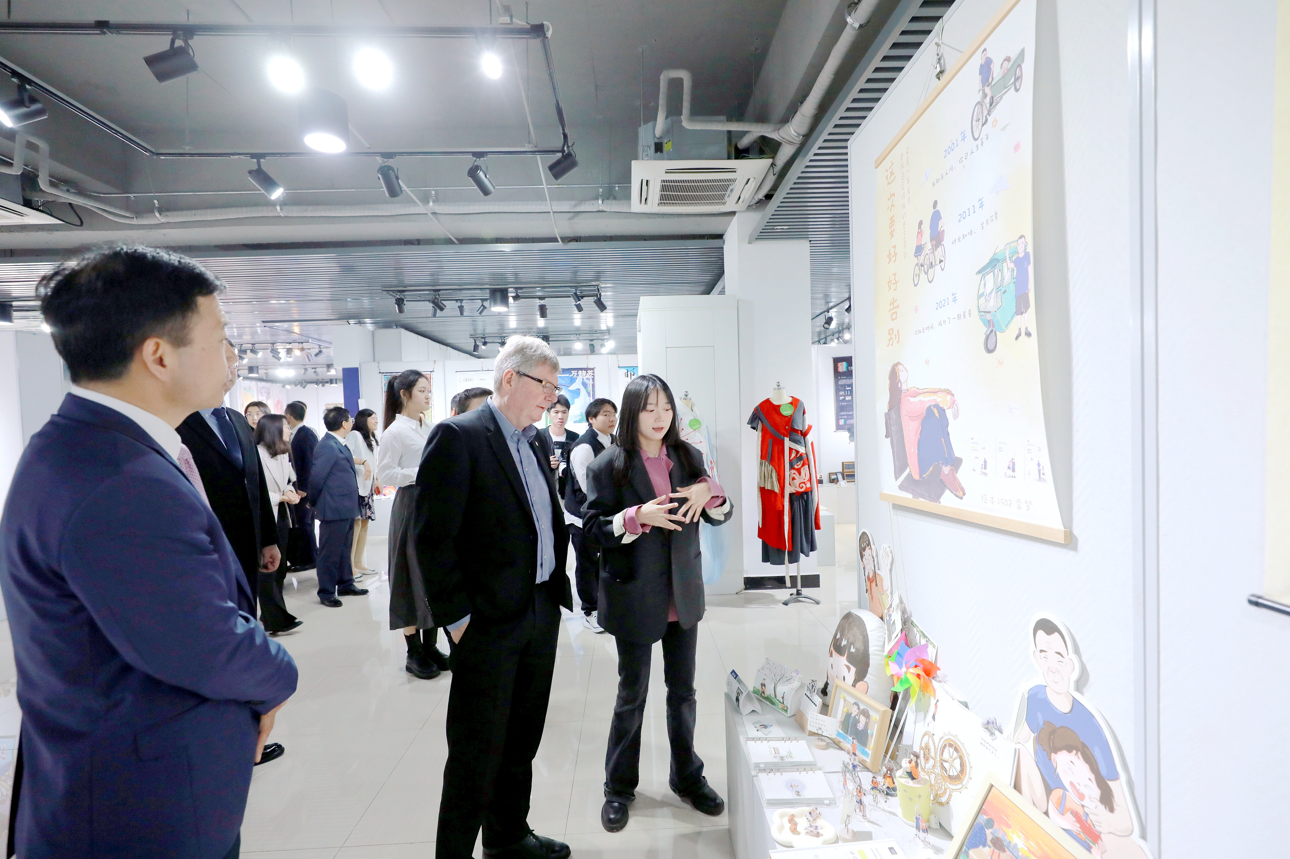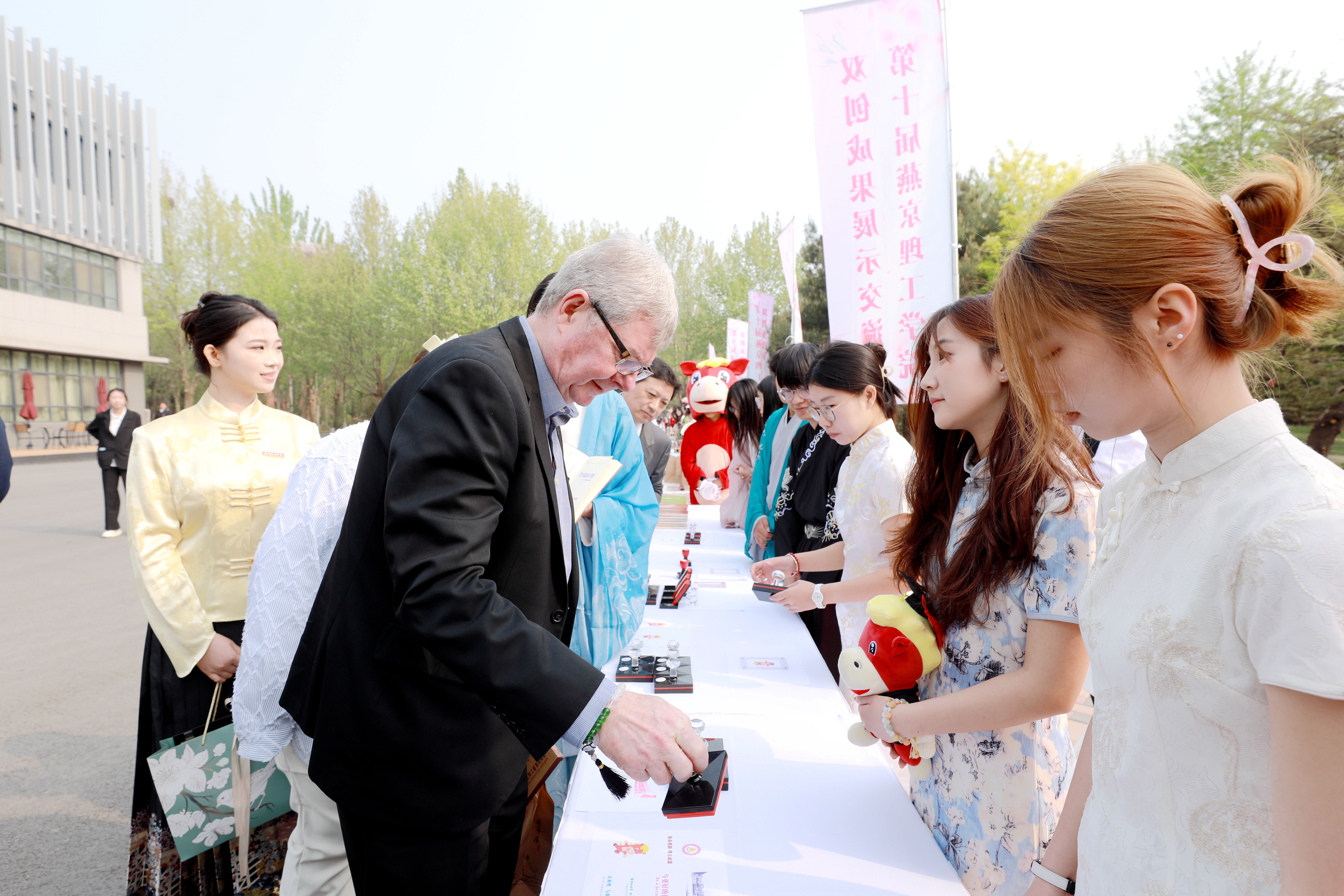 古典乐余音绕梁袅袅升起,手工剪纸的清明上河图栩栩如生,燕理学子身着传统服饰位列创新创业展。在各展位的依次介绍中,卡德韦尔教授津津有味的参观着学生的创新创业作品,学生们将精美团扇、菩提手串、印章京京的成品册等相赠卡德韦尔教授,在传承和弘扬中华传统文化中盛情迎客。