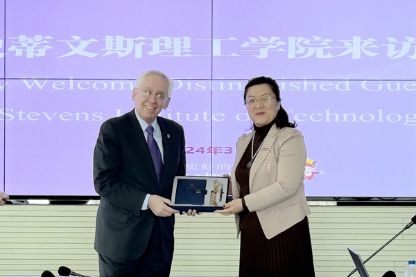 史蒂文斯理工学院副教务长康斯坦丁对美国史蒂文斯理工学院的特色学院和专业进行了介绍,他表示学校以科技为核心、以人为导向,注重学生的未来就业和发展,该校的就业率在美国院校里名列前茅。随后,双方就合作模式、学分置换、语言要求等合作问题进行交流。最后,双方互赠礼物并合影留念。