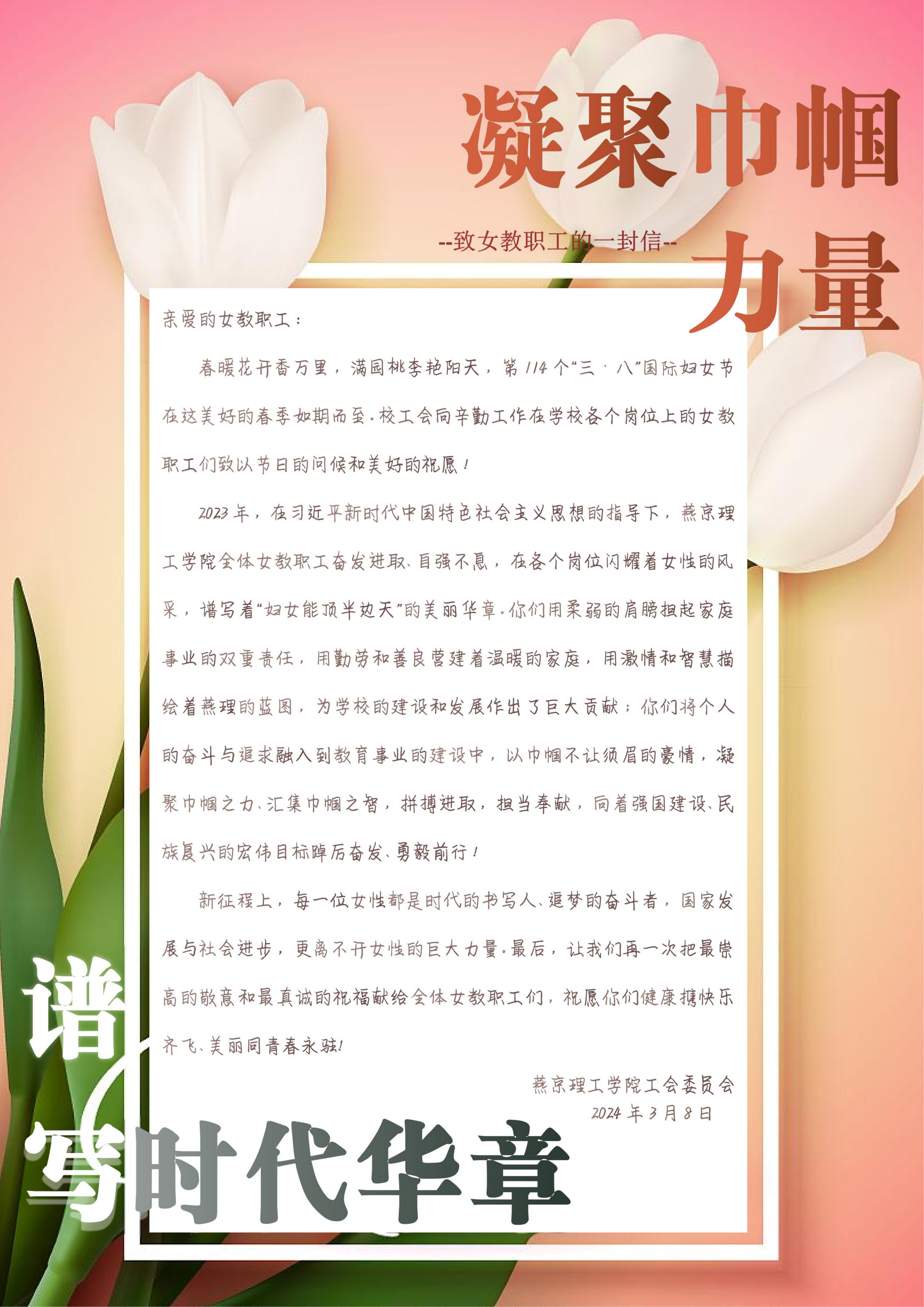 本网讯(党委办公室 郭雯)值此“三八”国际劳动妇女节,燕京理工学院向全校女教职工致以节日的问候和崇高的敬意!