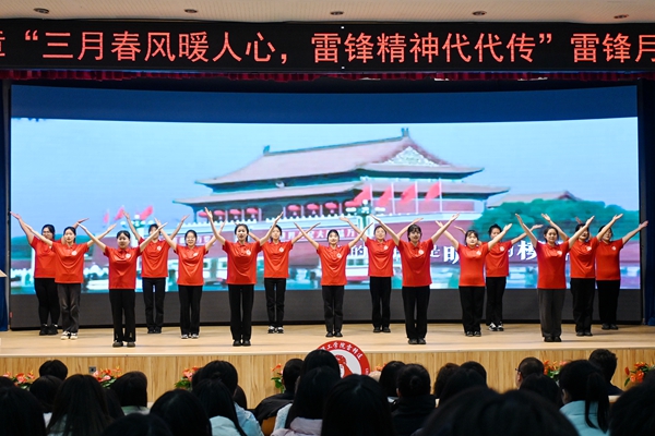 雷锋连连长石云平介绍了雷锋月相关活动并发出倡议。她倡议同学们坚定青春梦想,参与志愿服务,弘扬社会正气,引领社会新风,做新时代雷锋精神的传承者、践行者、推动者。与会人员齐唱《学习雷锋好榜样》,雷锋连全体成员宣誓。铿锵有力的歌声、掷地有声的誓言诠释了广大教育工作者及青年学生传承雷锋精神,投身志愿服务的坚定信念。手势舞《有我》展现新时代青年青春力量,彰显燕理学子的责任与担当、决心与梦想,真挚的情感引发观众们的思考与共鸣。