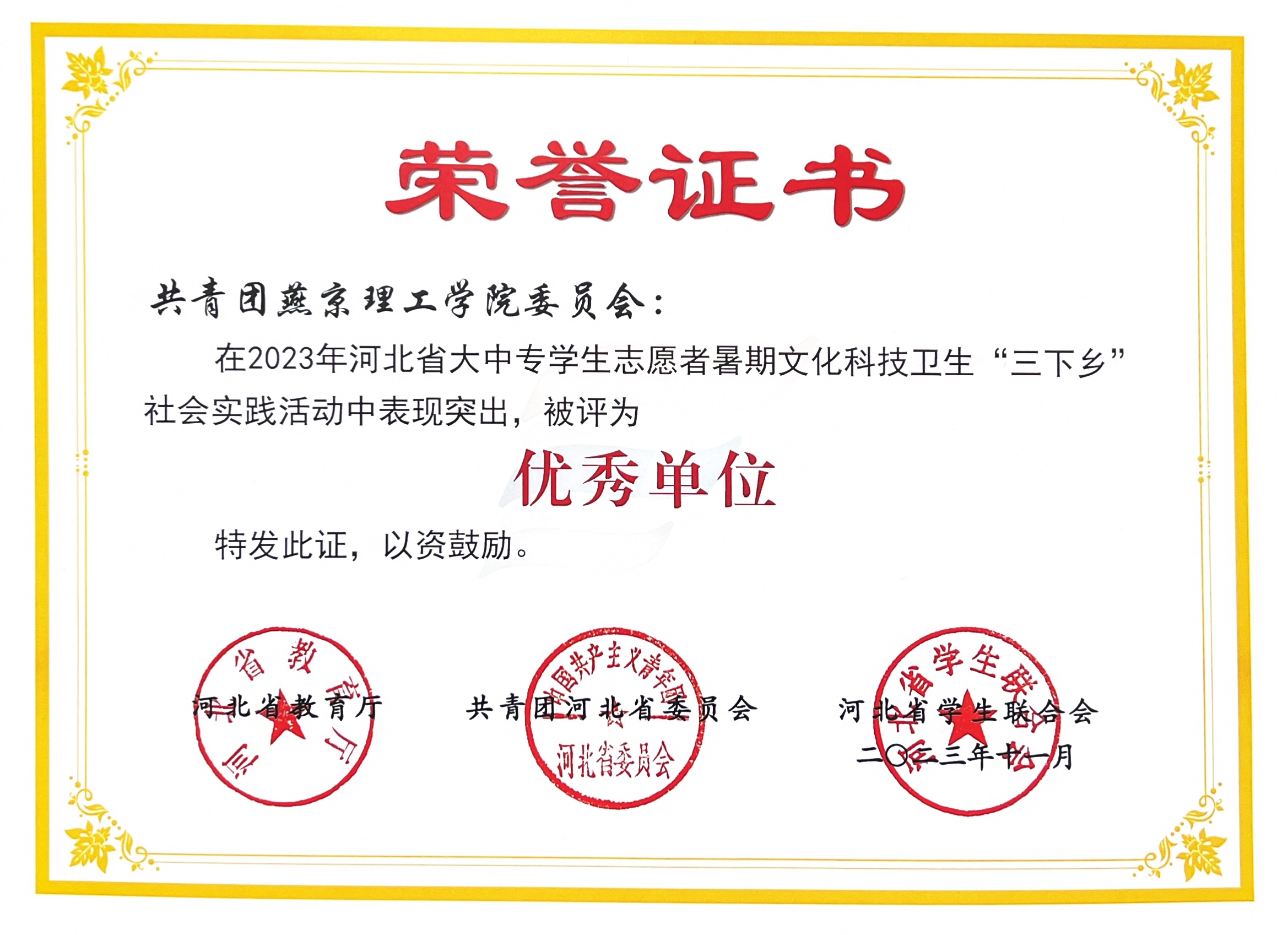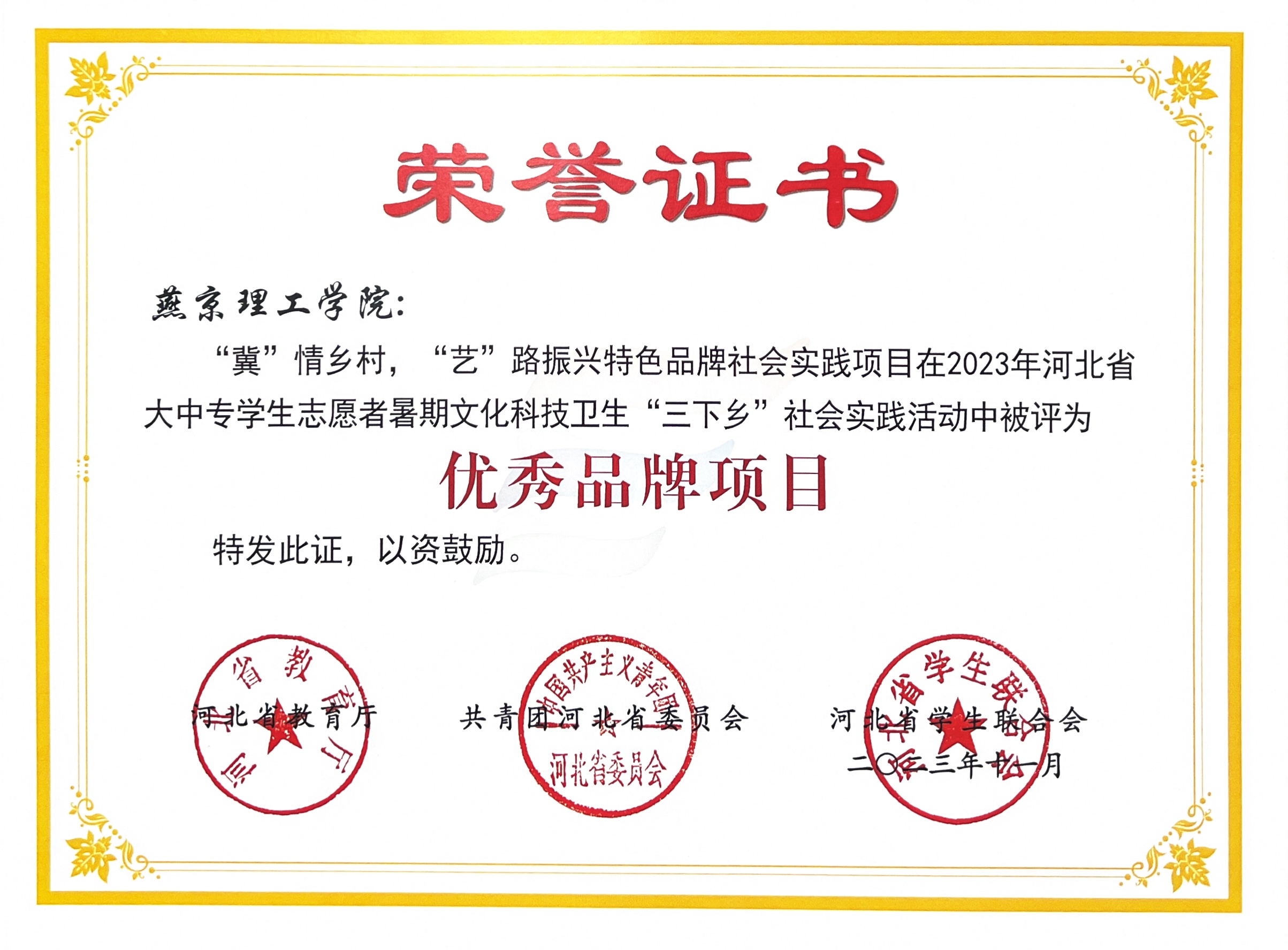 本网讯(艺术学院 学生处 曾令晋 宁一川 张晓为 杜庚鑫)近日,近日,河北省教育厅、共青团河北委员会及河北省学生联合会对2023年“三下乡”社会实践活动中表现优异的集体、个人和项目进行了嘉奖。我校校团委获得“优秀单位”称号,艺术学院“冀”情乡村“艺”路振兴特色品牌社会实践项目中被评为“优秀品牌项目”。