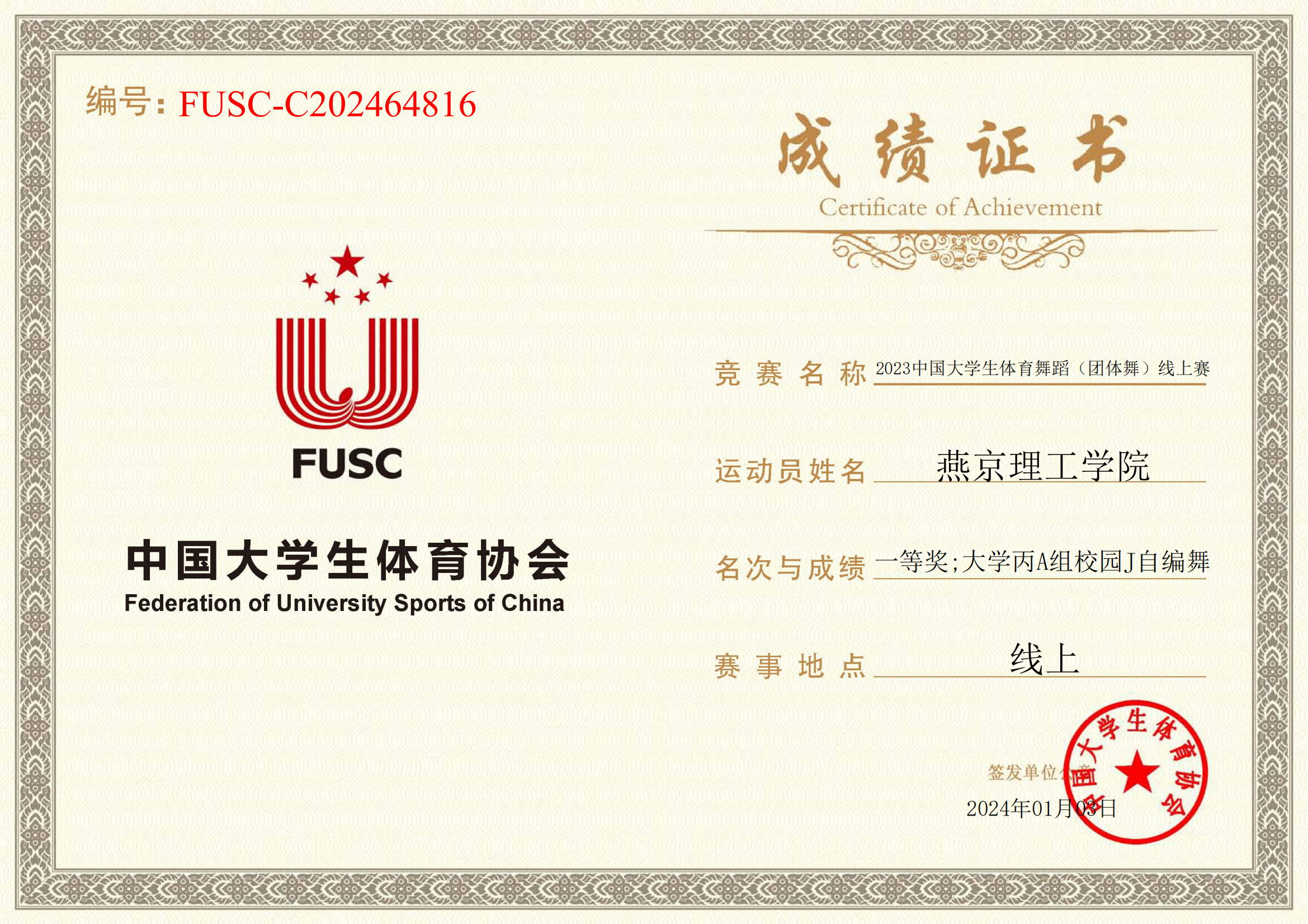 本网讯(体育学院 蒋帅 刘义芳)近日,由中国大学生体育协会主办、体育舞蹈分会执行的2023年中国大学生体育舞蹈(团体舞)线上赛顺利召开,燕京理工学院体育舞蹈运动队16名队员在蒋帅、宋雨竹两位教师的指导下,经过为期一个月的备赛准备,所报名参加的“丙A组校园牛仔自编舞”获得一等奖。