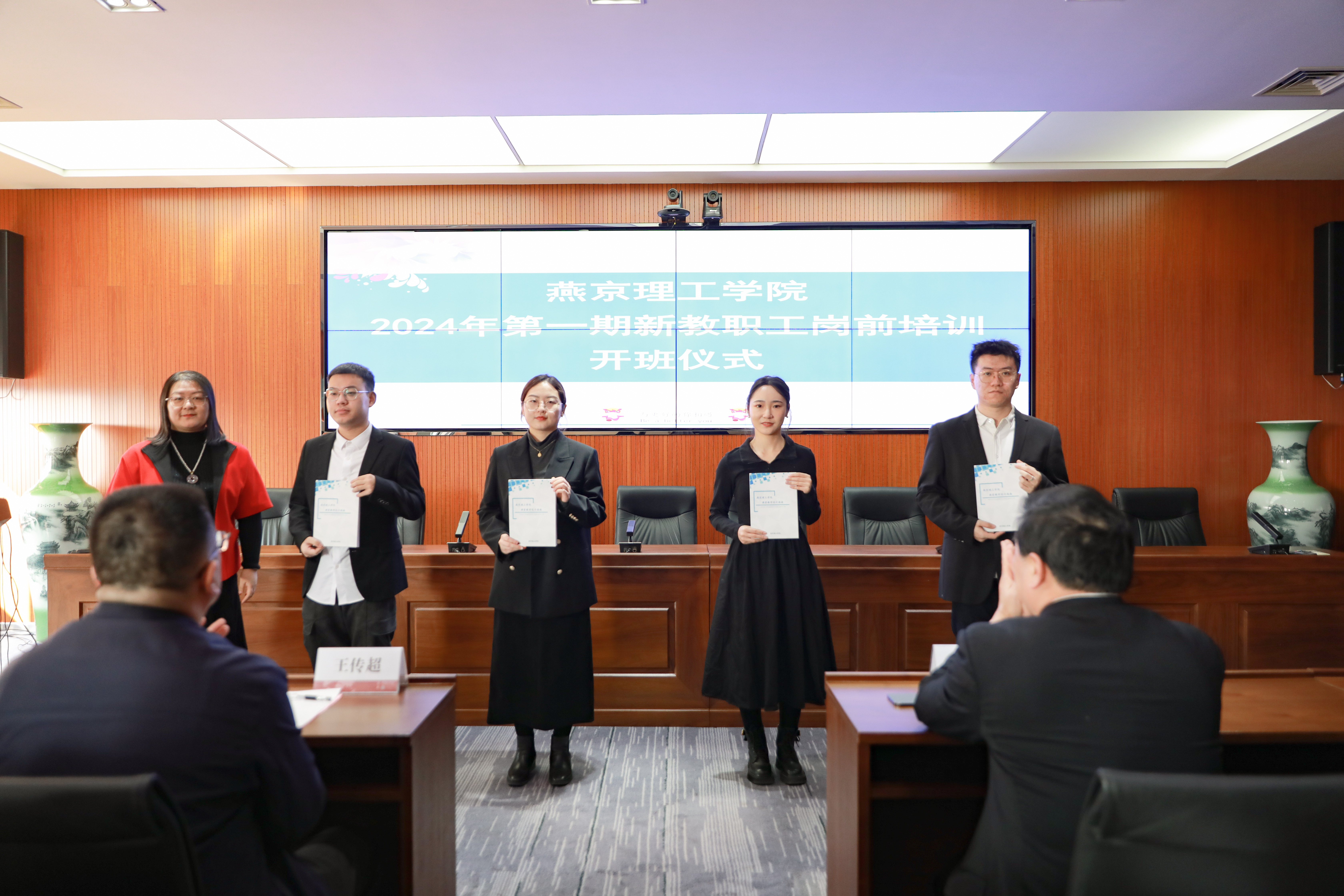 副校长吴汶燕为新教师代表赠送《燕京理工学院课堂教学设计指南》,该书由干部学院五期班编写,帮助新教师学习和了解课堂教学规律,更好地完成课堂设计,不断提高教学水平。