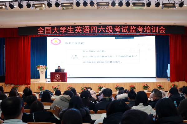 全国大学生英语四六级考试动员培训会在报告厅召开。副校长李庆作动员讲话,他对参与考试工作人员的辛勤付出表示感谢,并对考试提出总体要求,他希望各位老师思想上应高度重视此次考试,既要严格履行监考工作职责,同时也要关心考生,遇到非常规问题要及时联系巡考老师或考务办公室。相关组织、保障部门做好应急预案,为考生提供安静、安全的考试环境。