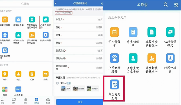 开发线上学生事务服务信息化平台。学生教育组先后对比并学习了金智、三易拓、超星平台。联合图文信息中心,在企业微信平台推进信息化建设工作。为保障学生心理困扰得到有效疏导和解决,企业微信线上开设了心理咨询预约功能,同时,搭建了师生意见反馈渠道,进一步加强学校的民主建设,更好地服务广大师生。