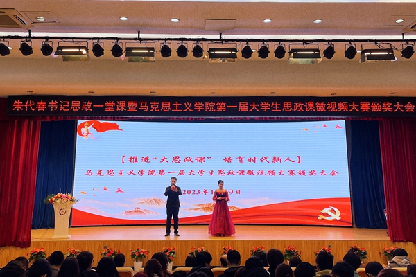 本网讯(马克思主义学院 宋佳慧 王欣欣 陈姿静 王国豪 陈紫琳 王欣欣 孙浩然 韩宇翔)为进一步推进“大思政课”实践教学,提升立德树人成效,11月9日,马克思主义学院在报告厅召开了“推进‘大思政课’ 培育时代新人”马克思主义学院第一届大学生思政课微视频大赛颁奖大会。学校党委书记朱代春,马克思主义学院负责人、思政课教师以及来自各个学院的学生代表共计500余人参加此次活动。