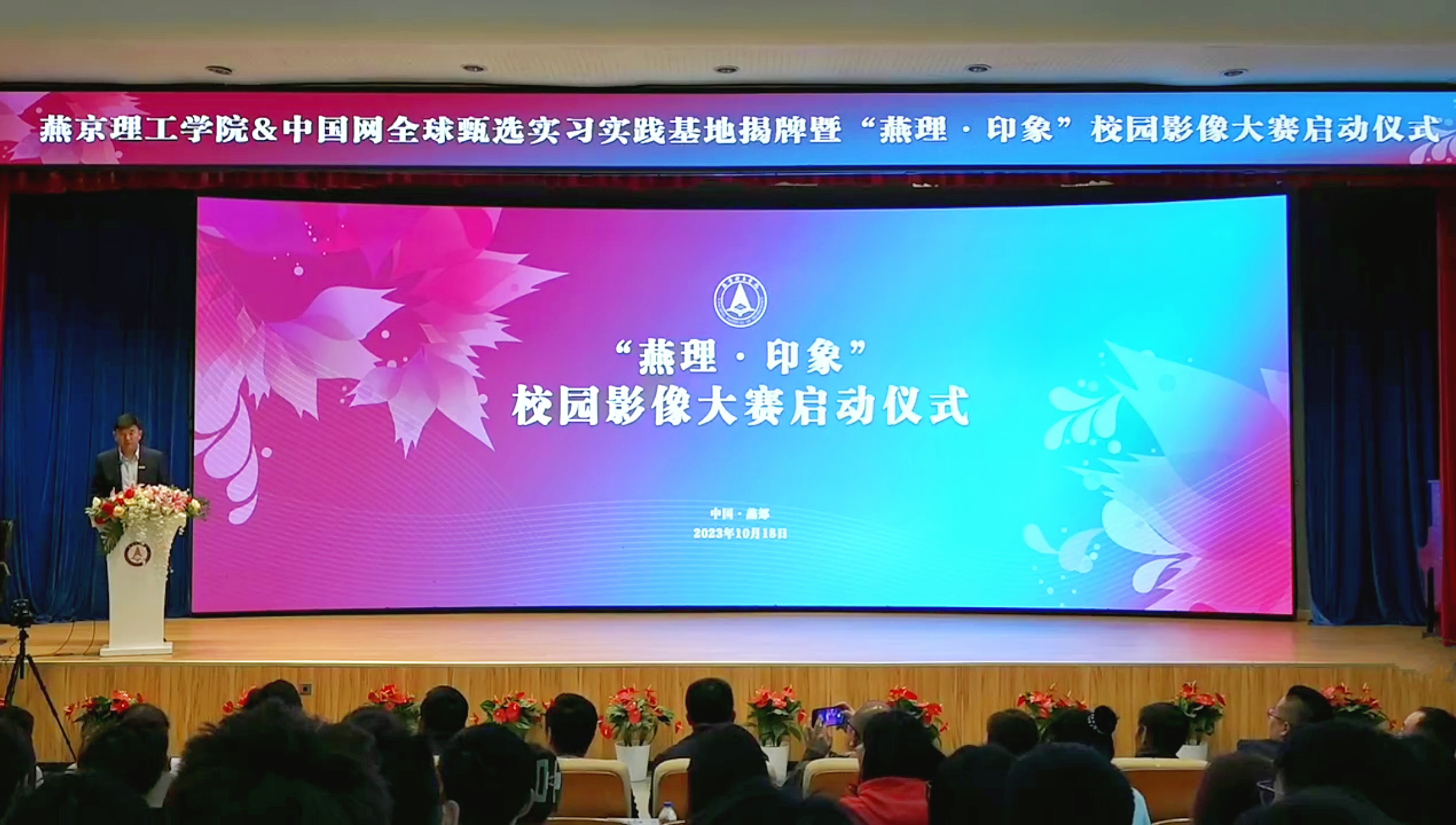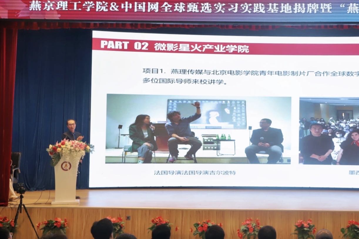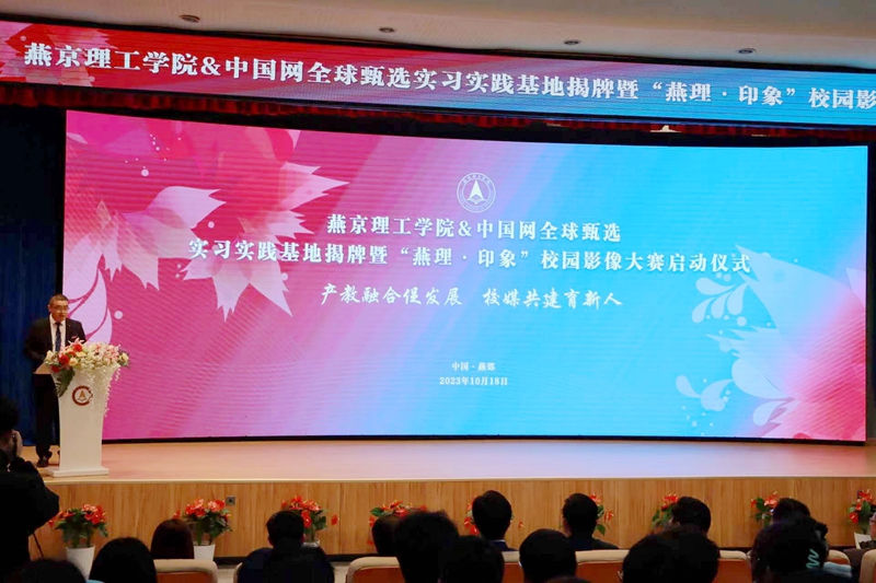 本网讯(党委宣传部 李家曾 刘婷婷 付盛通 谷是瑾 石芮源 何思达 陈锦腾 阎相熹 窦雄鑫 许兴耿 闫亚琳 李俊铭 贺雨欣 李培锦 许博涵 薛金艺 魏乐祯 窦鹏润 王鹤璇)产教融合促发展,校媒共建育新人。为深入推进产教融合、校媒合作,展现美好生活社区建设成果,10月18日,燕京理工学院&中国网全球甄选实习实践基地揭牌暨“燕理·印象”校园影像大赛启动仪式在学校报告厅举办。中国网全球甄选总编辑殷楠、副总编辑王道峰、总编辑助理赵维,中国摄影家协会会员、北京摄影家协会会员柳军旗,北京裕龙人才有限责任公司副总经理温家瑞,北京盛隆广告有限公司总经理孙一博;燕京理工学院党委副书记、副校长王传超,校长助理赵鹏,学校党委宣传部、就业指导与校企合作中心、传媒学院、艺术学院有关负责人,各处室、学院通讯员,以及传媒学院有关专业学生代表和本次校园影像大赛参赛学生代表参加了活动。