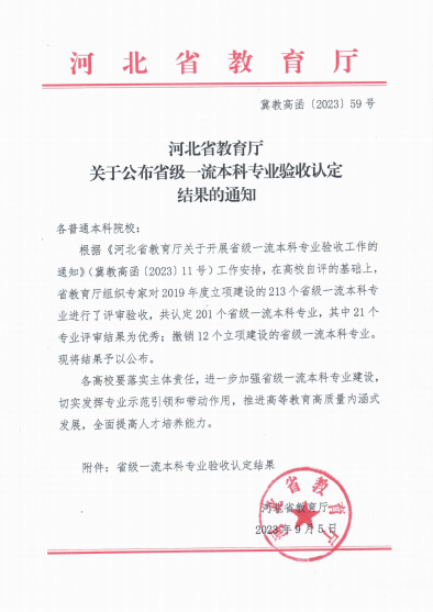本网讯(教务处 李丽荣)9月5日,河北省教育厅发布《关于公布省级一流本科专业验收认定结果的通知》(冀教高函〔2023〕59号),我校制药工程、法学、会计学、物流管理、物联网工程、产品设计6个专业全部顺利通过验收,并被正式认定为河北省一流本科专业。