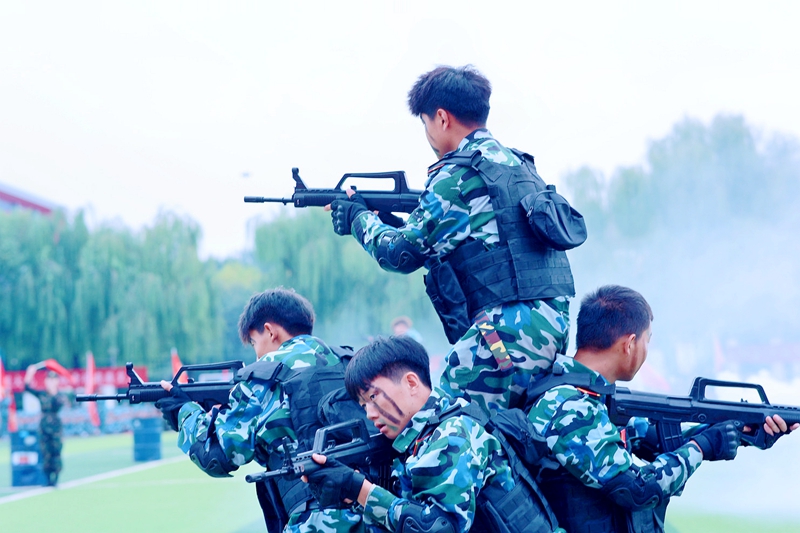 现场,万名学生进行了训练成果展示。34支方队分列式步伐坚定、口号铿锵,战术、反恐方队整齐划一,擒敌拳表演一拳一式刚劲有力、拳法行云流水,刺杀操表演声彻校园,匕首操表演气势如虹,应急棍表演燃热血、铸军魂,旗语表演挥斥方遒……精雕细琢方成器,千锤百炼始成钢。一身戎装,一腔热血,英姿飒爽,2023级新生“沙场秋点兵”,展现了军训训练的卓越成果。