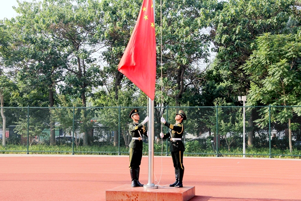 仪式正式开始前,升旗手庄严地升起国旗,全场同学肃立,奏唱国歌。