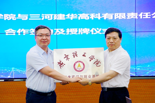 智能工程学院院长李秋生和建华高科有限责任公司总经理段成龙代表校企双方签订校企合作协议,杨庚宇校长为三河建华高科有限责任公司授予燕京理工学院大学生实习就业基地牌匾。