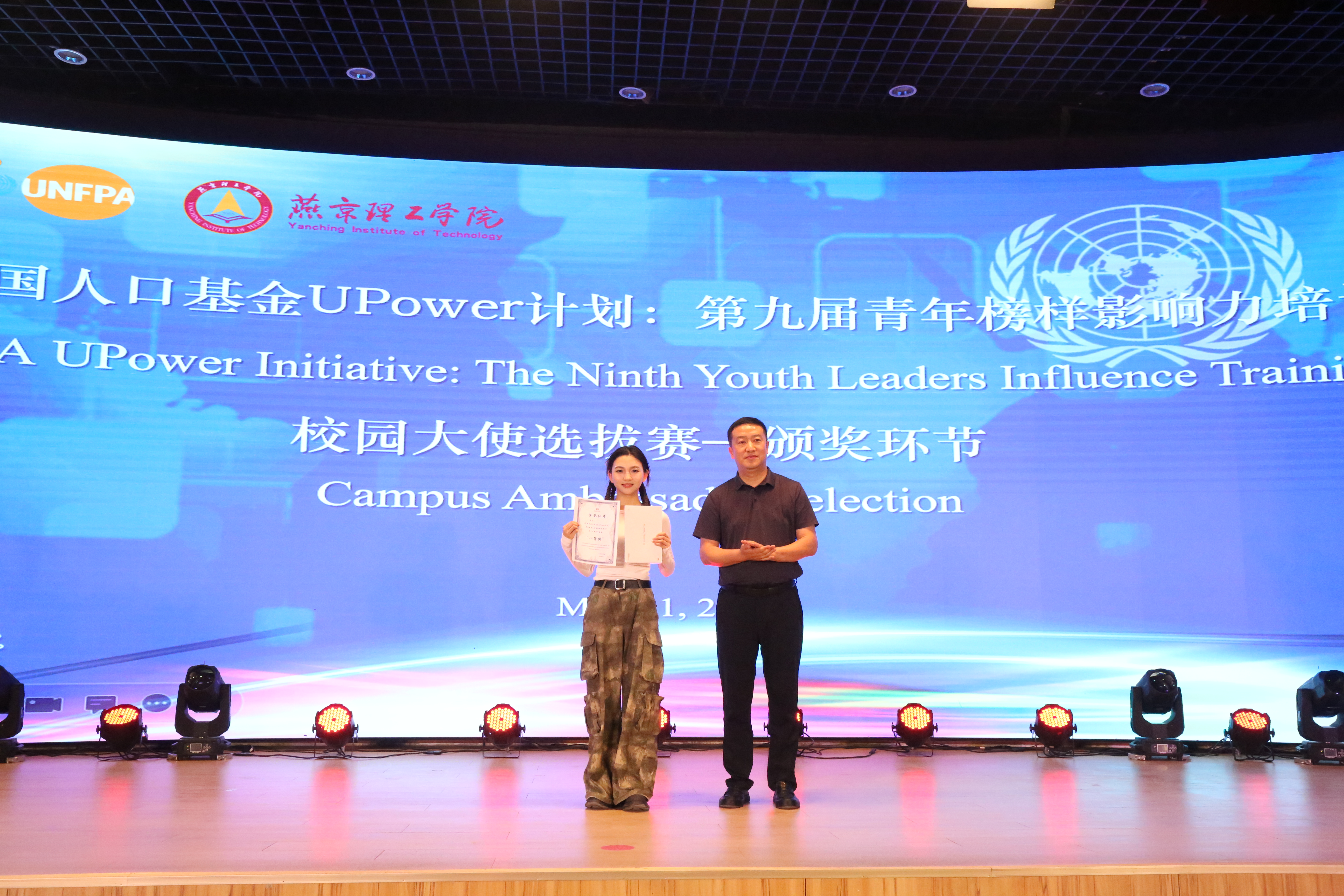本届决赛正式开始前,校长助理赵鹏为“联合国人口基金 UPower计划:第八届青年榜样影响力培训”学员颁发培训结业证书。同时,吴晓闪同学作为第八届校园大使代表发表培训感言,并为第九届校园大使选拔决赛选手送上祝福。