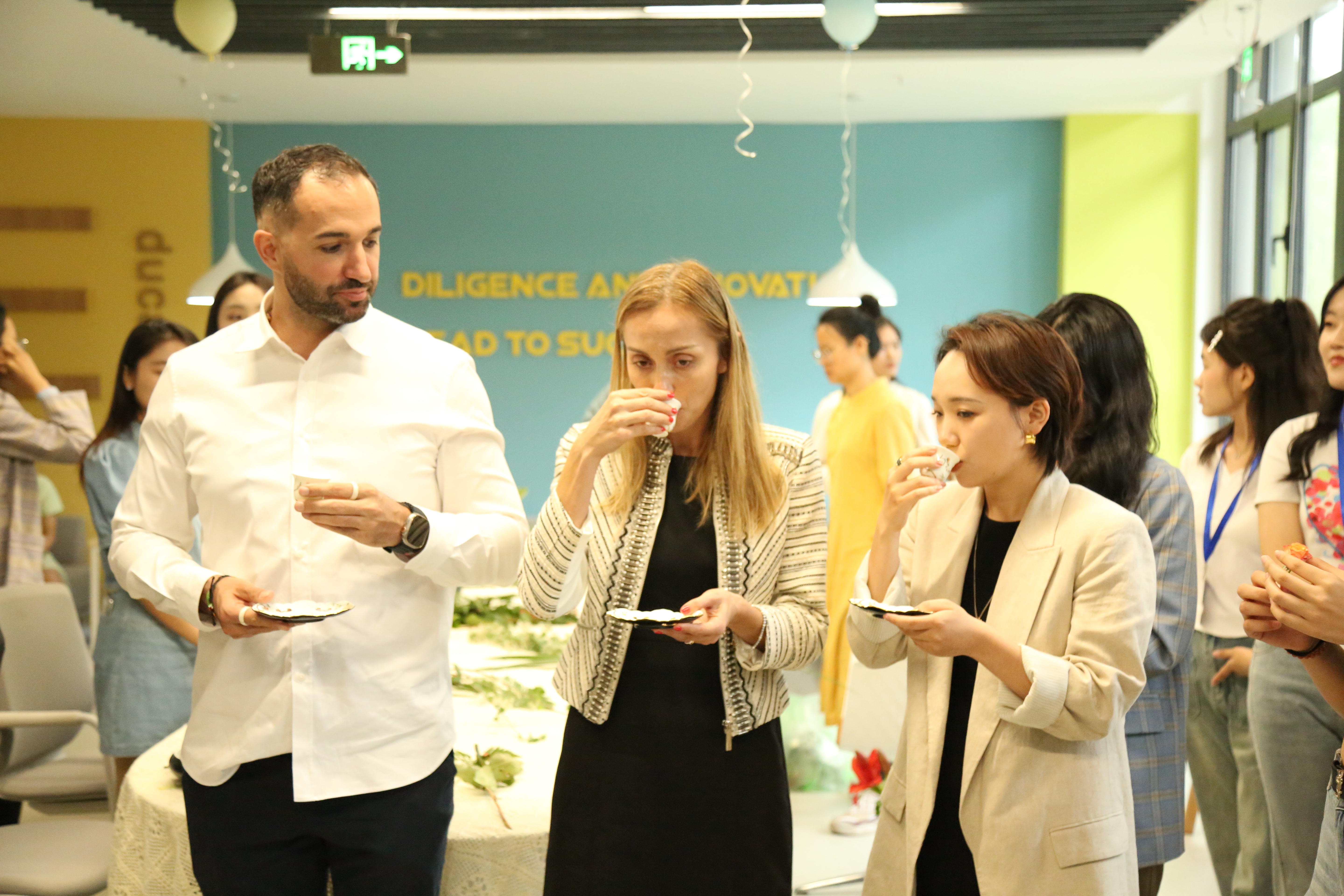 欧雯珊女士与现场的同学们一起体验中式插花。活动特邀国家高级花艺师朱明辉为欧雯珊女士详解花艺知识及插花技艺。戏剧影视导演专业任艺青同学是国家中级茶艺师,她以茶会友,现场进行了茶艺表演,邀请欧雯珊女士和在场同学们一起品茗。第八届校园大使曾祥军同学演唱了英文版《水调歌头》,让欧雯珊女士和现场同学感受了中华诗词之美。