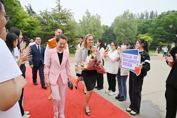 本网讯(国际教育学院 白静 李树运 宣传部 杨烁琦)5月27日,联合国人口基金驻华代表处副代表欧雯珊一行4人到访燕京理工学院,与学生代表共话可持续发展目标的实现,共同体验中式插花和传统茶艺。燕京理工学院党委常务副书记、副校长刘元园,校长助理赵鹏与学生代表参加欢迎仪式及有关活动。